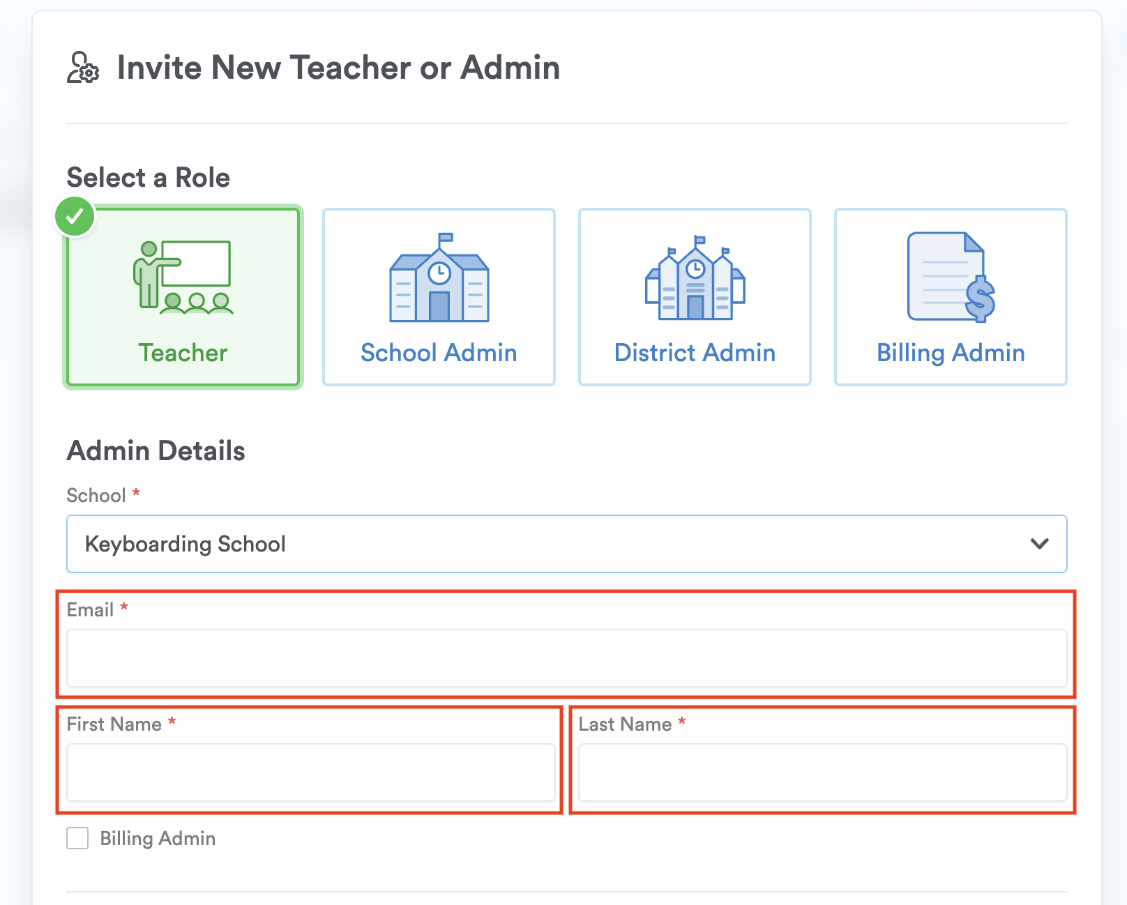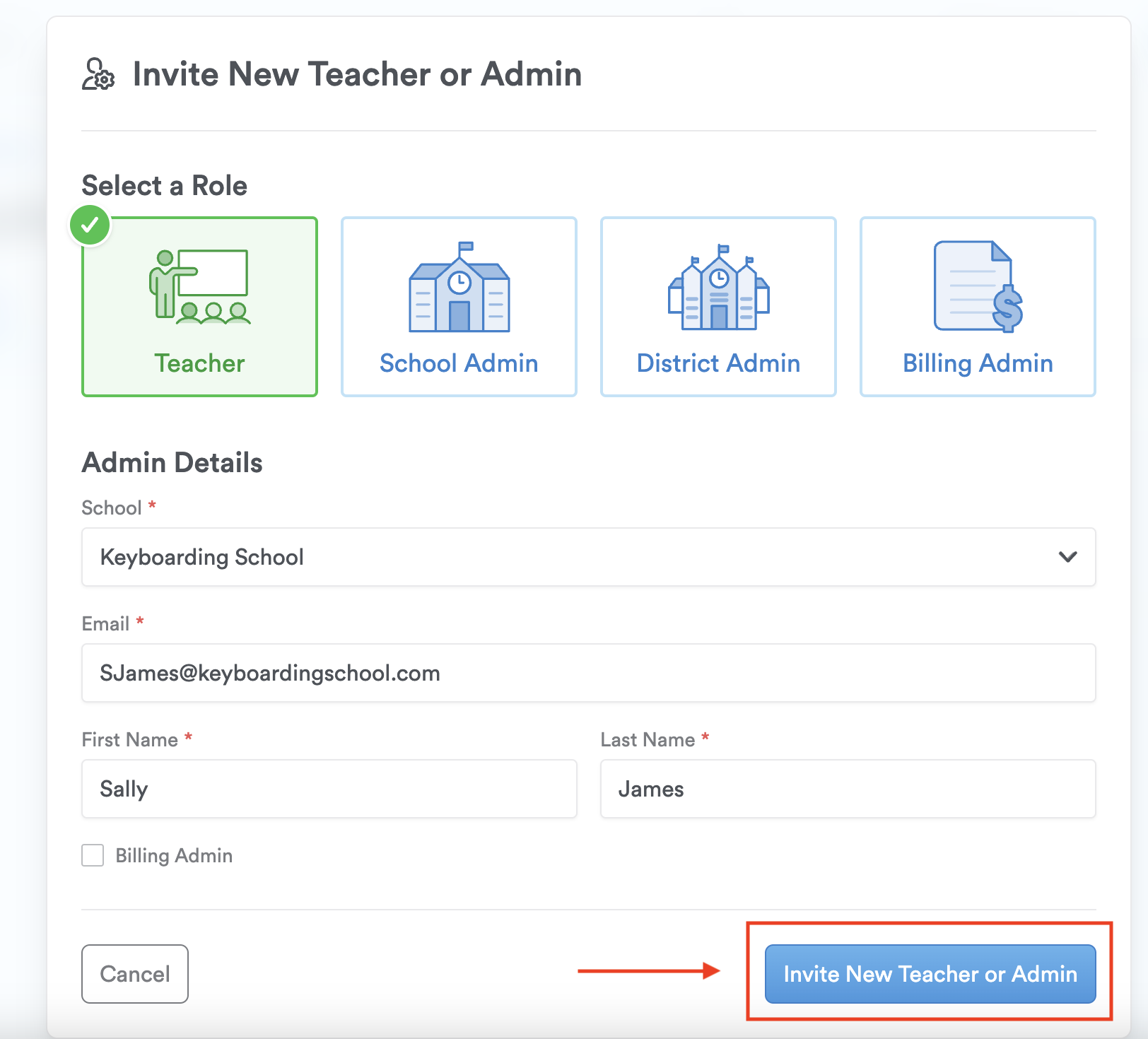 Pro-Tip: You can select the checkbox labeled "Billing admin" if you want this teacher (or admin) to manage Typing.com purchases.