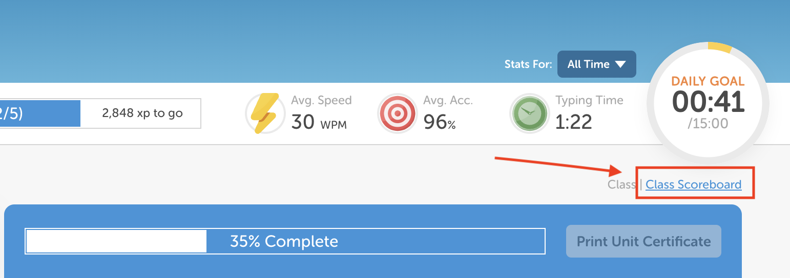 Class Scoreboard: If you're part of a class and wish to check the Class Scoreboard, you can click the button on the dashboard below your typing stats.