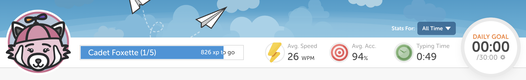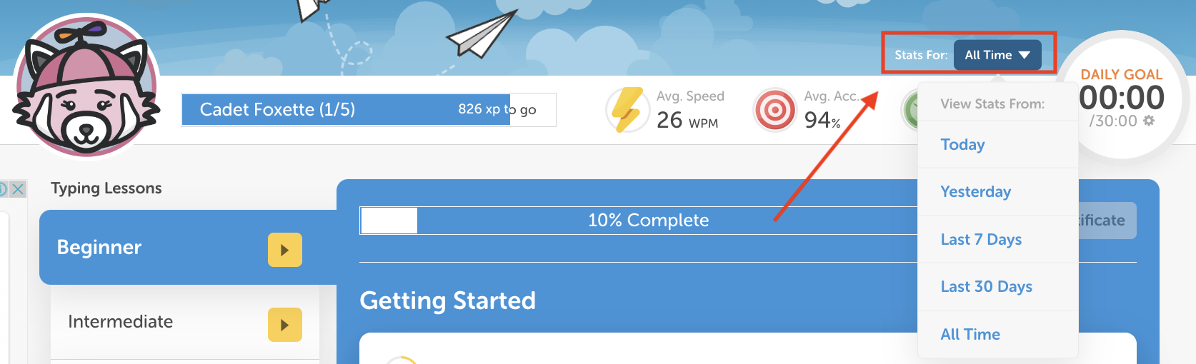 Statistics & Daily Goal: On the top part you can see your statistics for typing time and adjust your daily goal.
