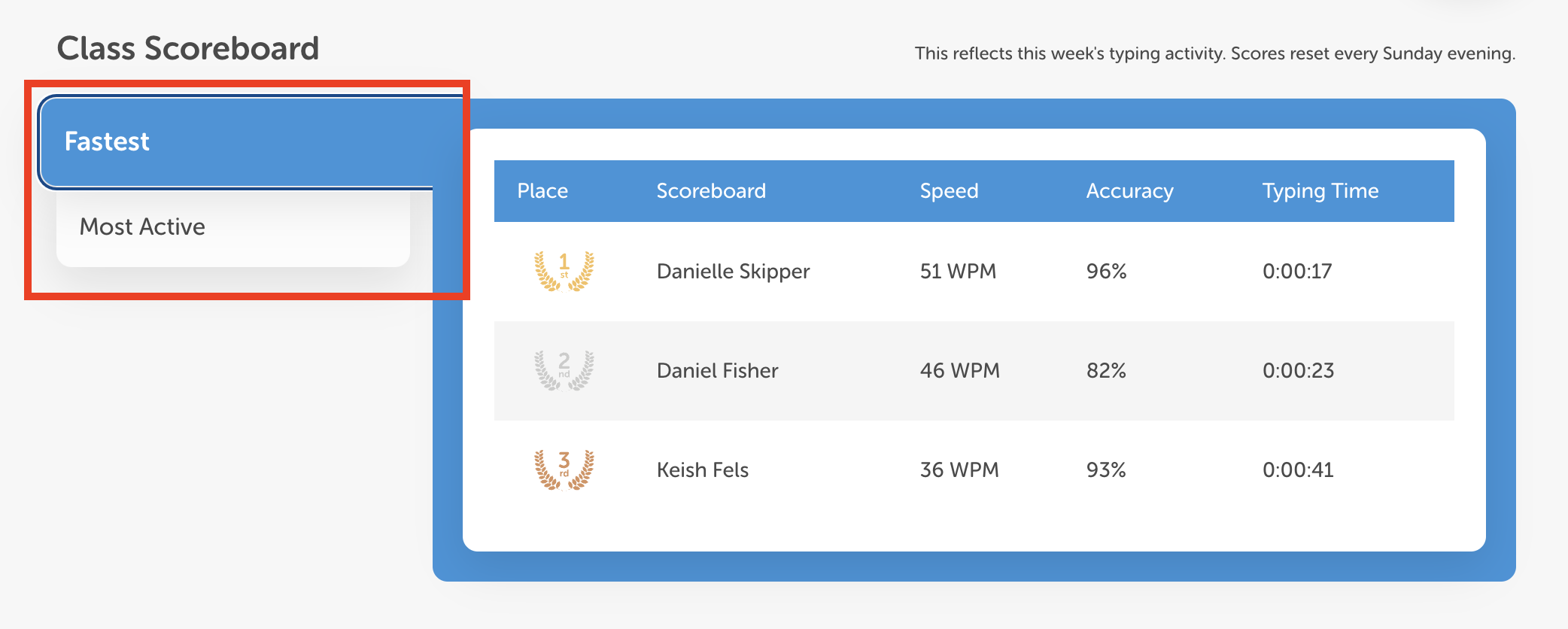 Once you’re inside the Class Scoreboard page, you can filter the results by Fastest or Most Active.