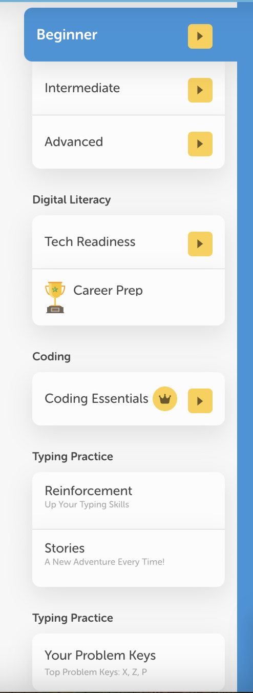 If this is your first time learning to type, we recommend starting at the Beginner level. However, if you already have some experience, you can choose a higher level at any time. You can even change the curriculum you are using. To change the curriculum, follow these steps here.