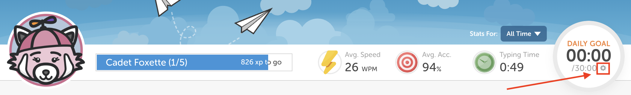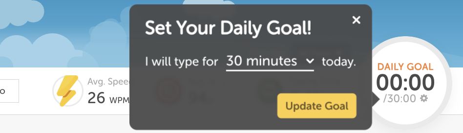 Change Daily Goal: You can also change and update your daily typing goal by clicking on the gear icon located inside "Daily Goal."