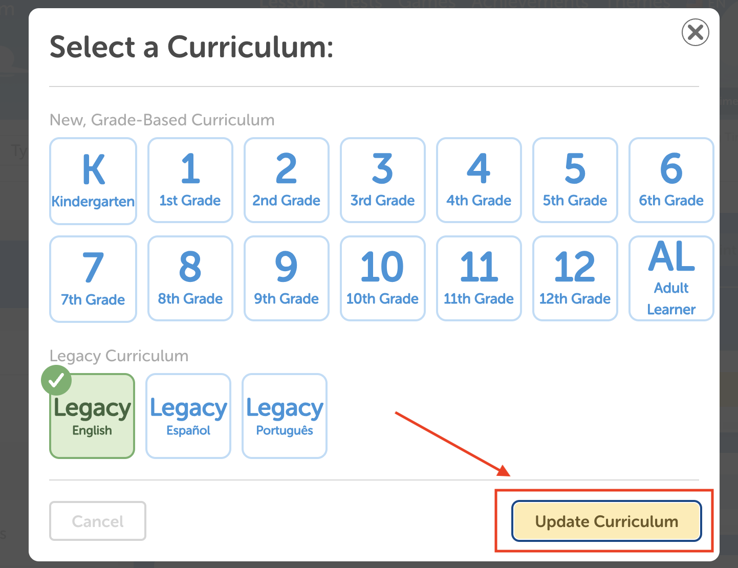 Step 3: A pop-up box will appear presenting you with various curriculum options to choose from. Once decided, simply make your selection and click "Update Curriculum."