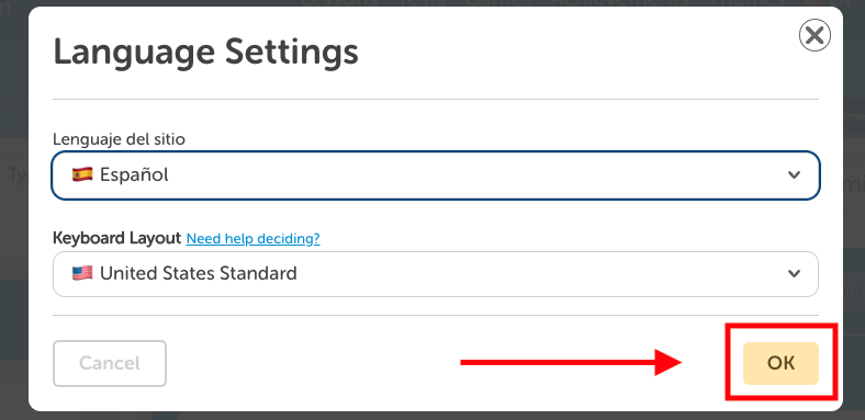 Step 3: A pop-up box will appear, presenting you with two drop-down menus. One allows you to change the website language, while the other lets you adjust the keyboard layout to match your preferred language.