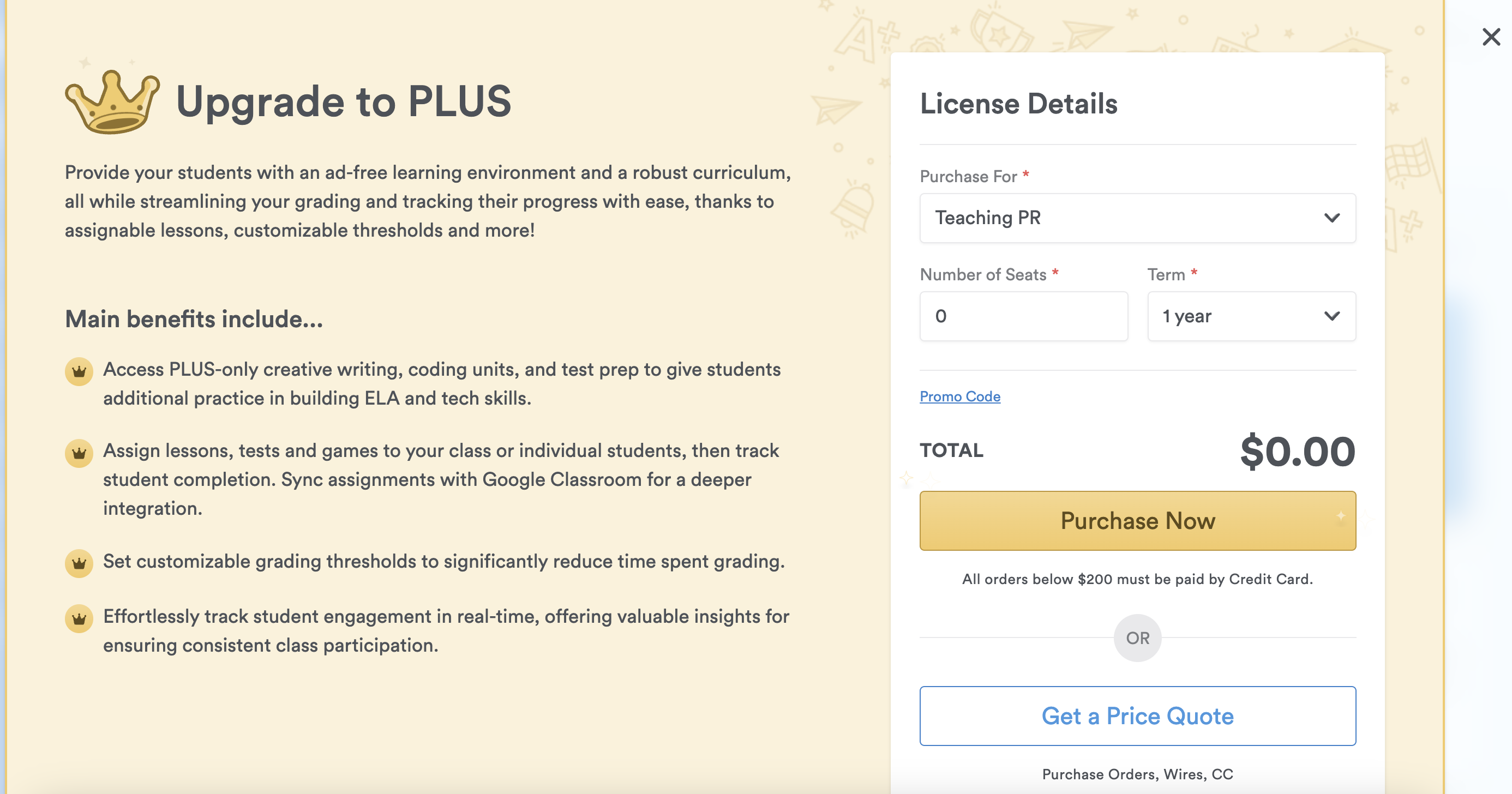 Pro-TipIf you created your account type as a school or district admin, you will have the option to pick who the purchase is for. If you created your account as the role of a teacher, you will not have the option to purchase for a school or district.