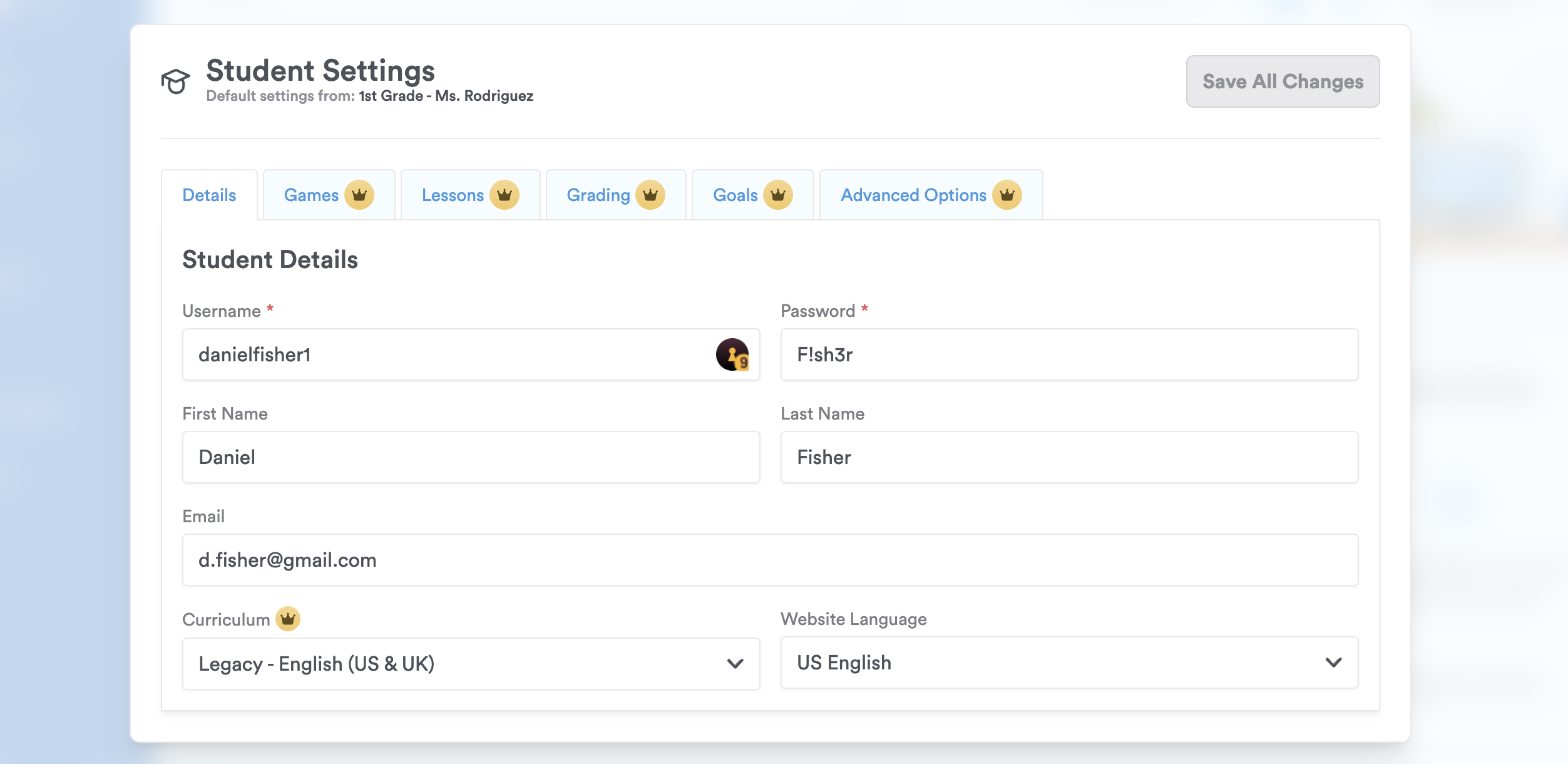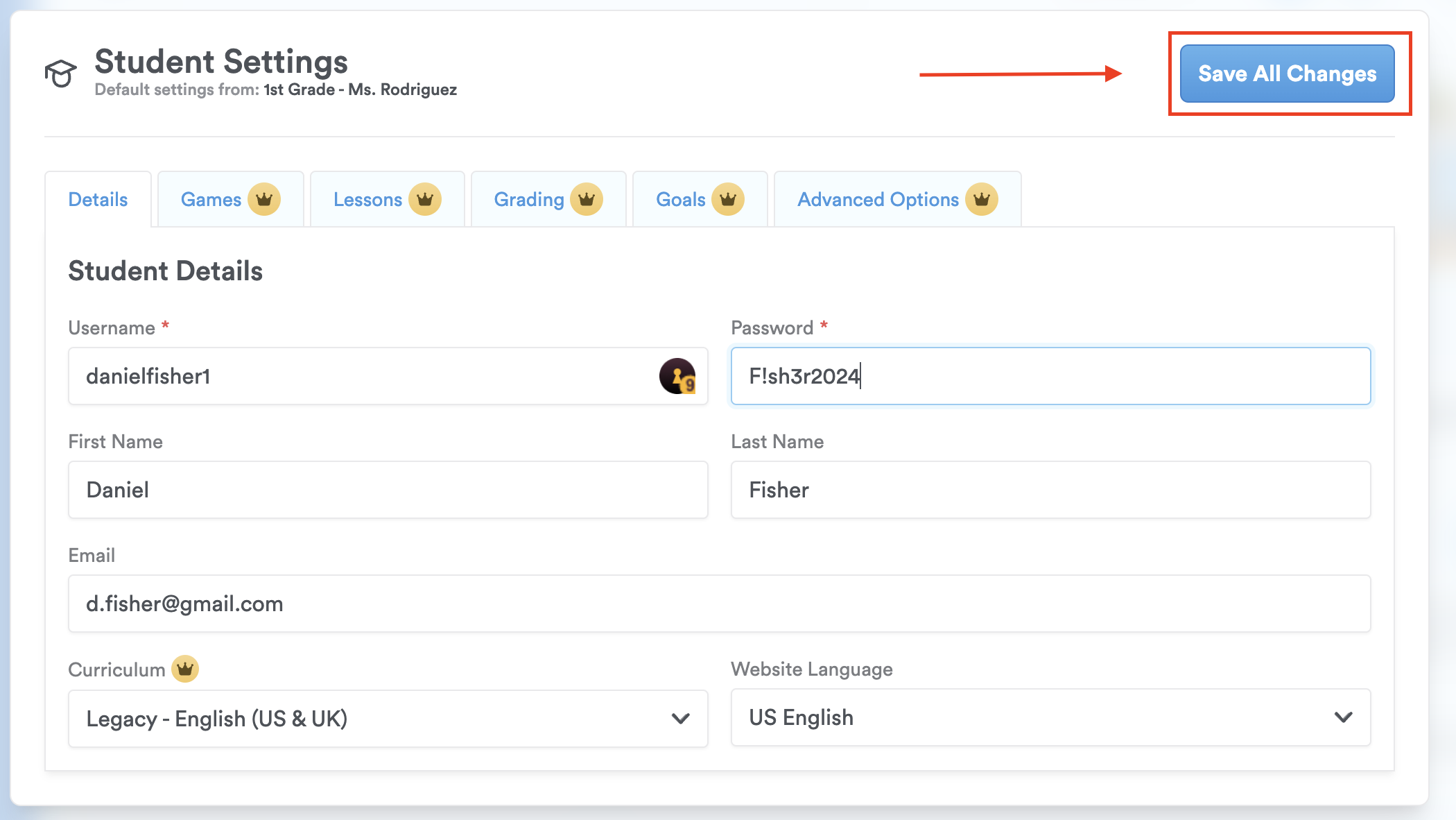 Step 9: Change the student's information and click 'Save All Changes'.