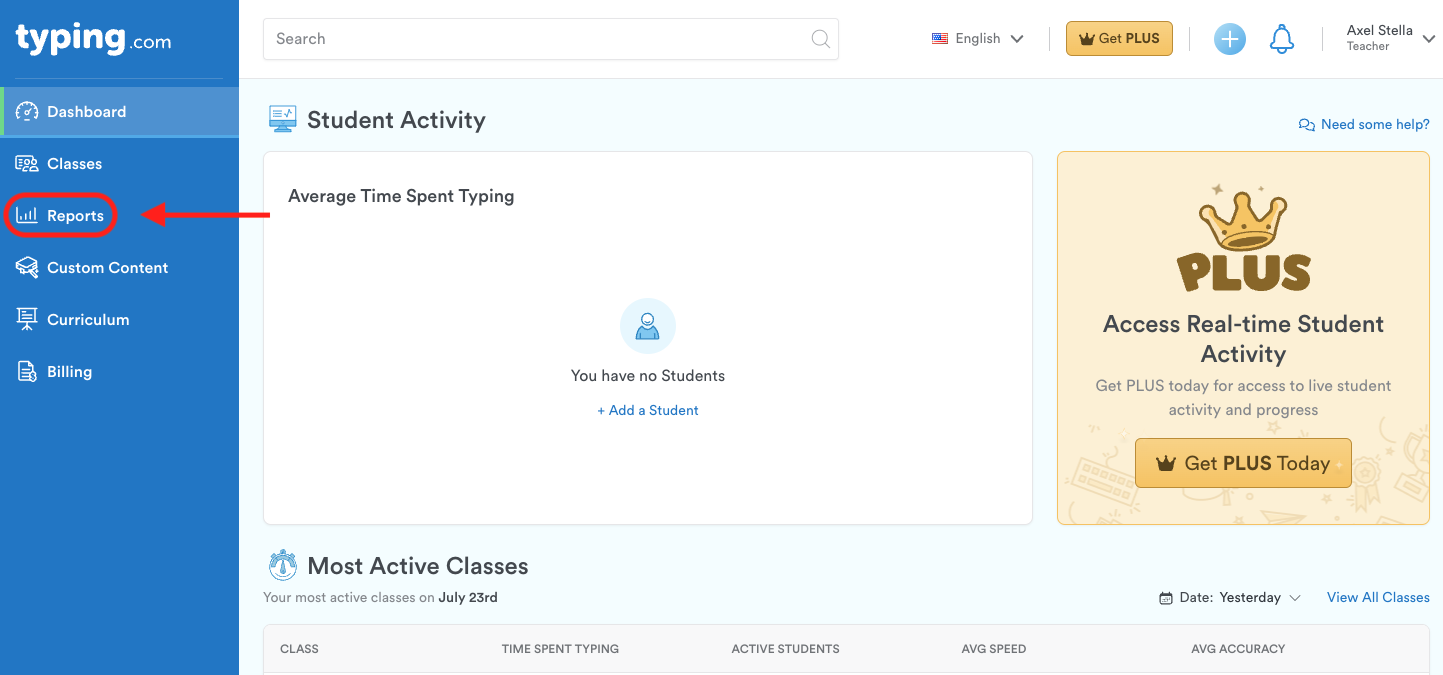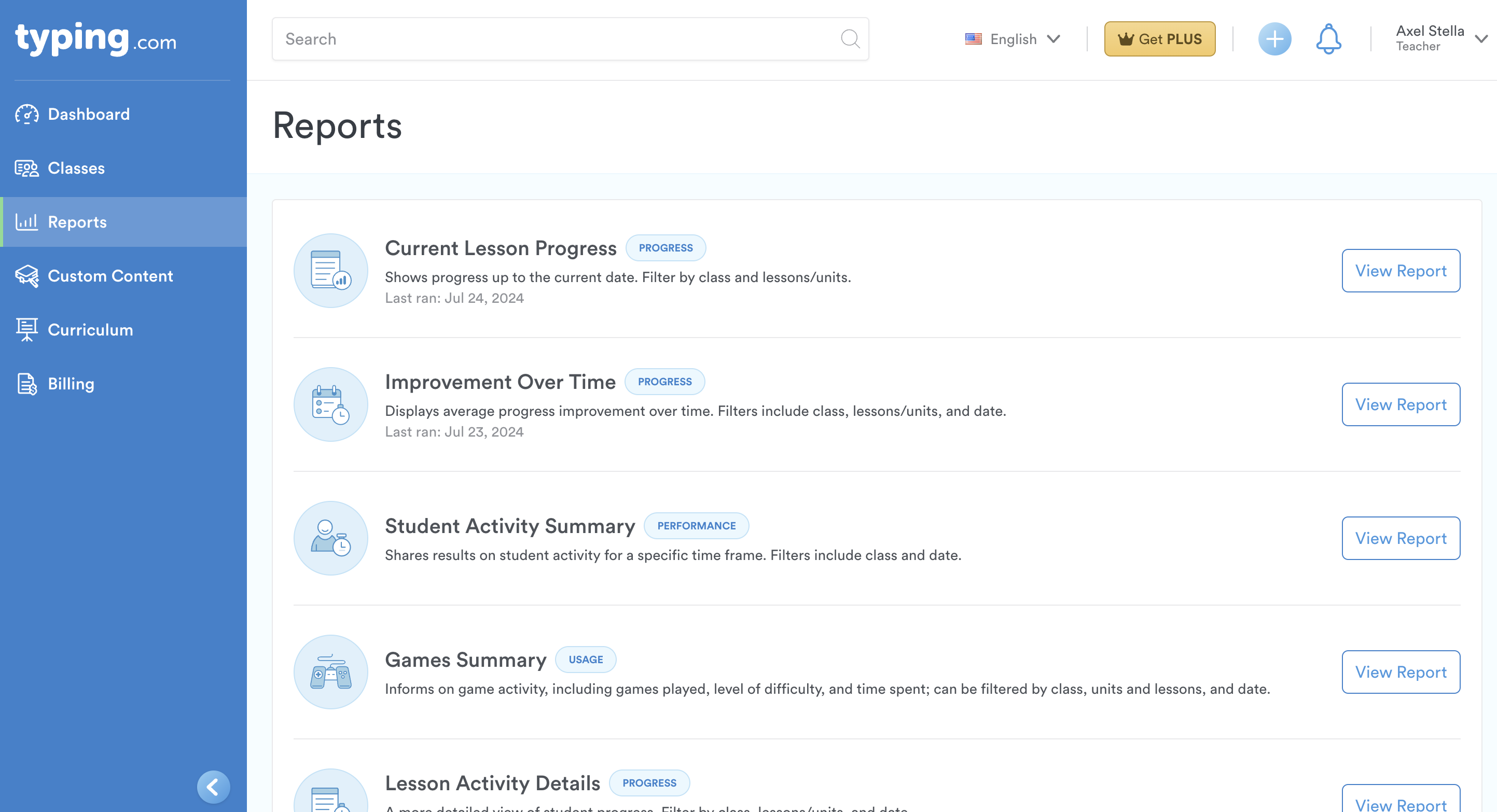 Typing.com has different types of reports that focus on particular sections of the program. They are easy to understand and use, with settings you can modify to answer what you want to know. They give you anything from a general idea of progress across the semester and up to specific details on performance on a given date.