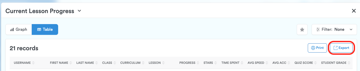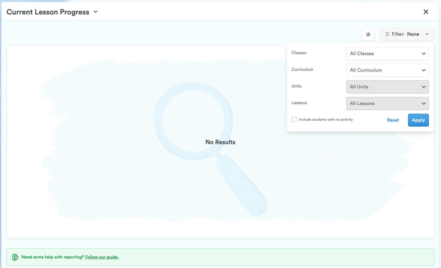 Current Lesson Progress - shows progress up to the current date. Filter by class and lessons/units.