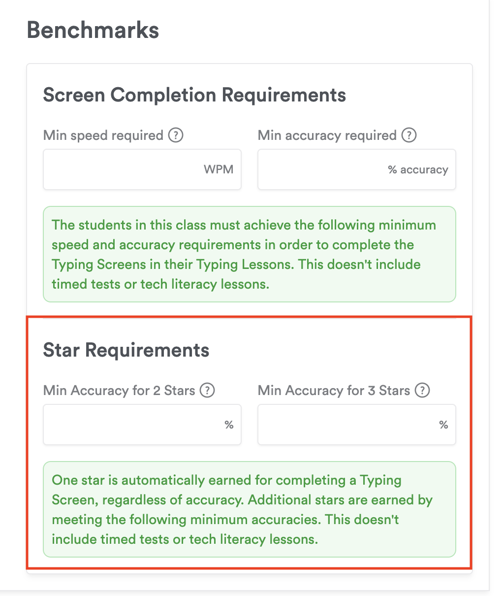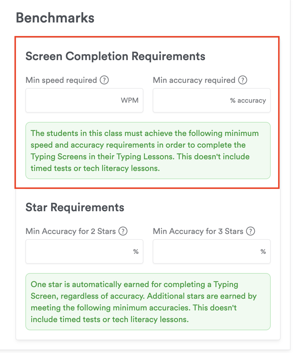 Step 5A: In the 'Benchmarks' section, set the minimum accuracy, speed, or both that students must achieve to complete a typing screen and move on to the next. If students do not meet the minimum requirements, they will need to complete the typing screen again.