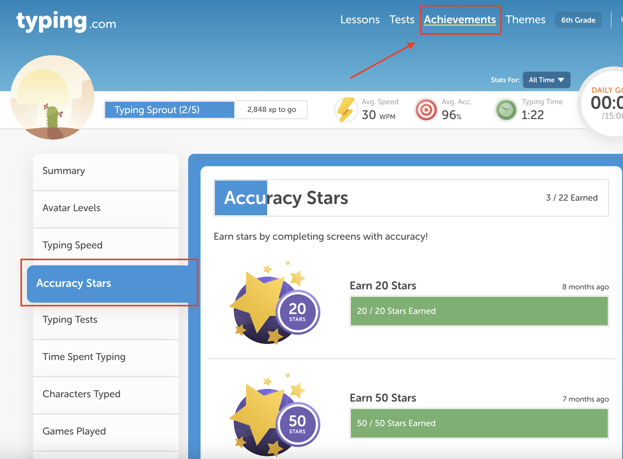 Have you noticed the stars at the end of each screen? These stars are achievements that students earn based on the accuracy settings you set. Students can earn up to three stars per screen, depending on their typing accuracy.