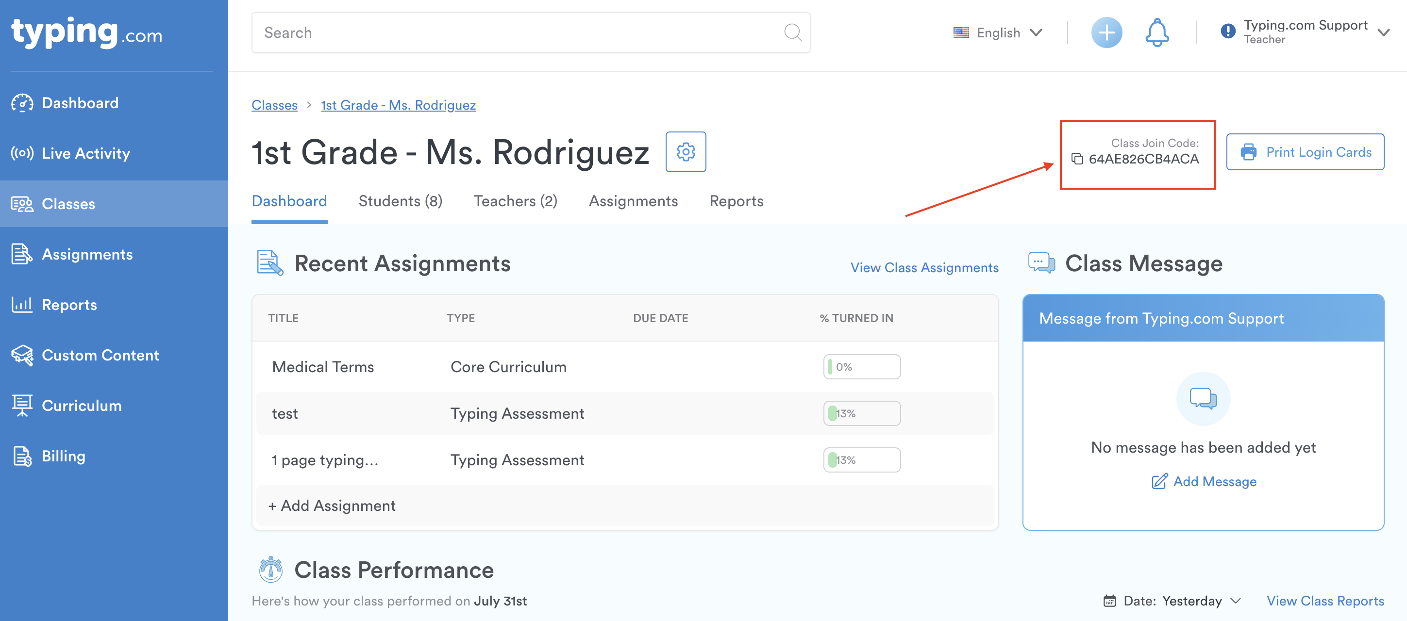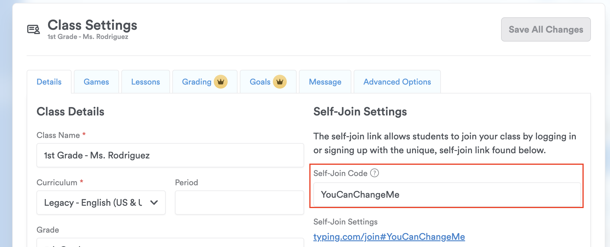 Pro-Tip 3: You can edit the self-join code (the alphanumeric code at the end of the link) to make it simpler (ie: typing.com/join#YouCanChangeMe) by visiting your Class Settings > Details tab.