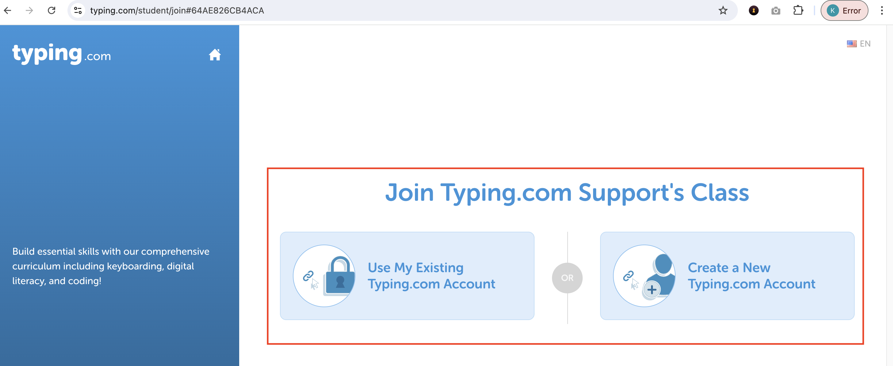 Step 6: Students will be directed to a page where they can choose to join the class by creating a new account or using an existing one. They will select an option and proceed.