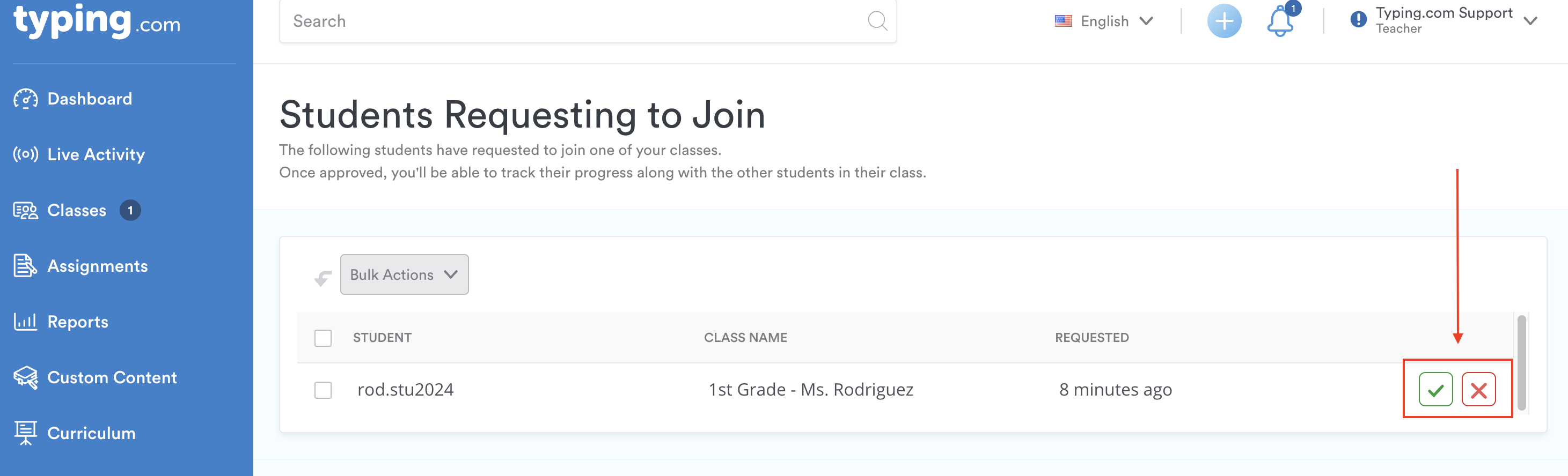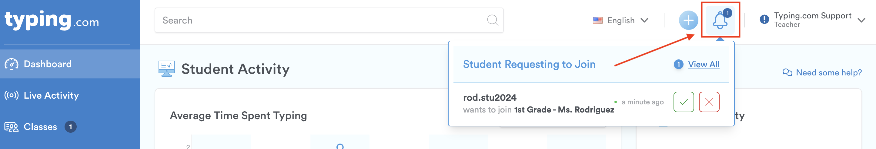 Pro-Tip: For a quick way to see student join requests, check the bell icon at the top of the page. Click on it to accept or reject requests.