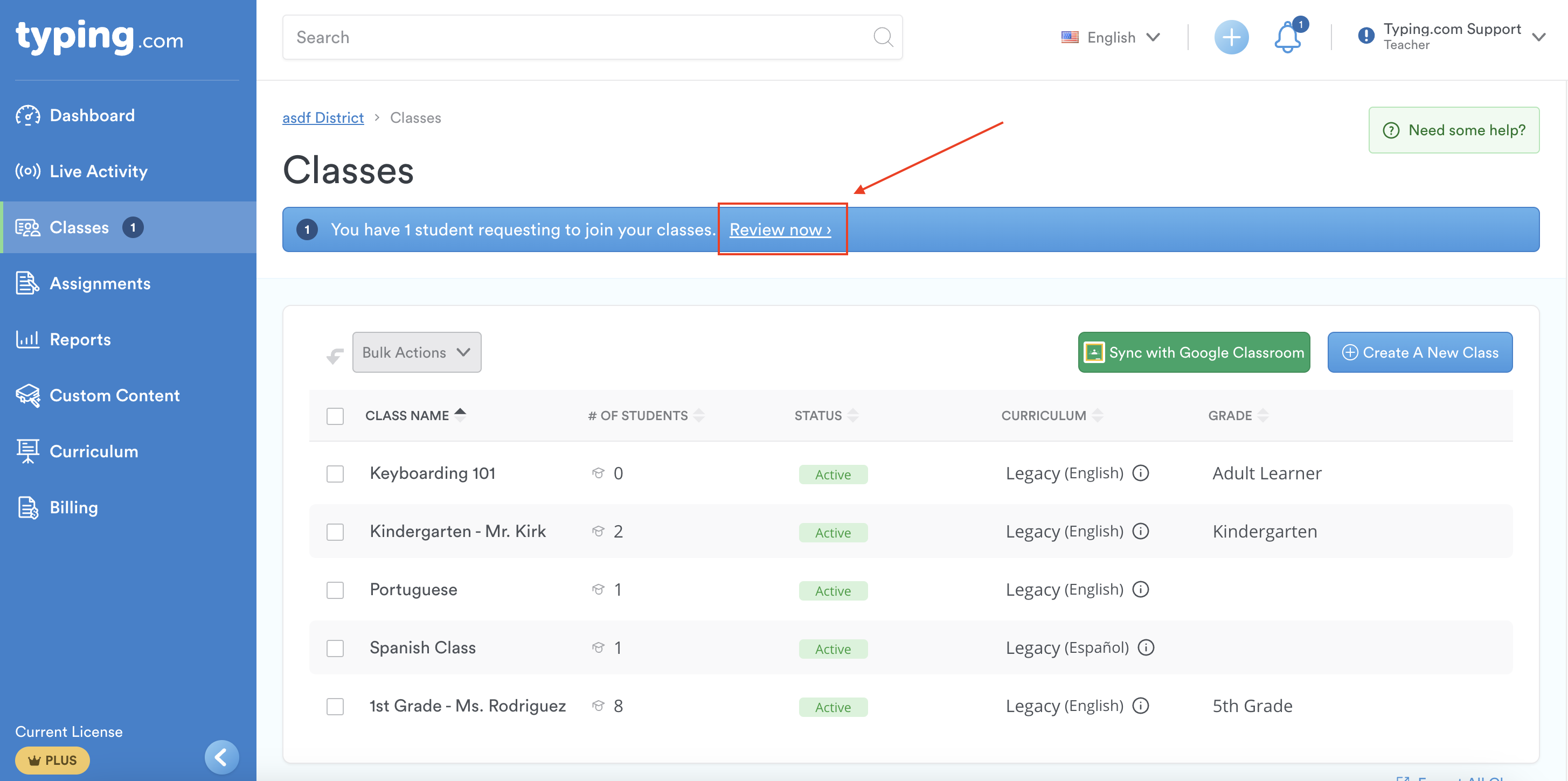 Step 7: After students follow the steps above, go to your Teacher Portal to accept (or reject) each student's request to join your class. These requests will appear on your “Classes” page. Click 'Review now.'