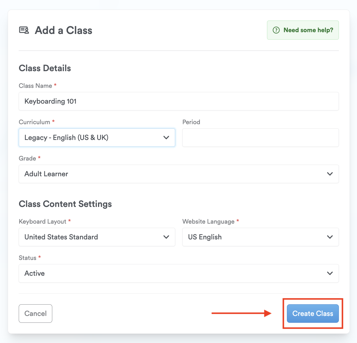Step 4: Enter the class's details such as the class name, curriculum, grade, keyboard layout, and class status.