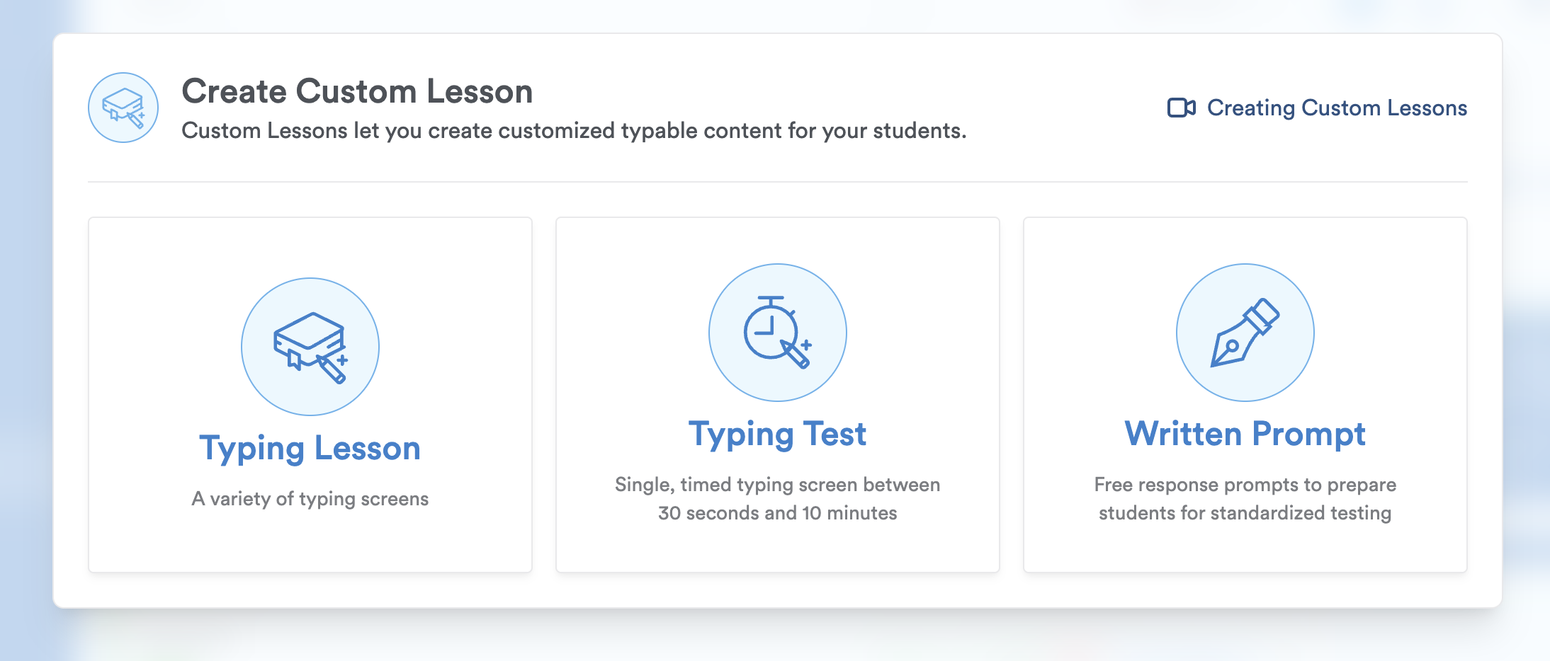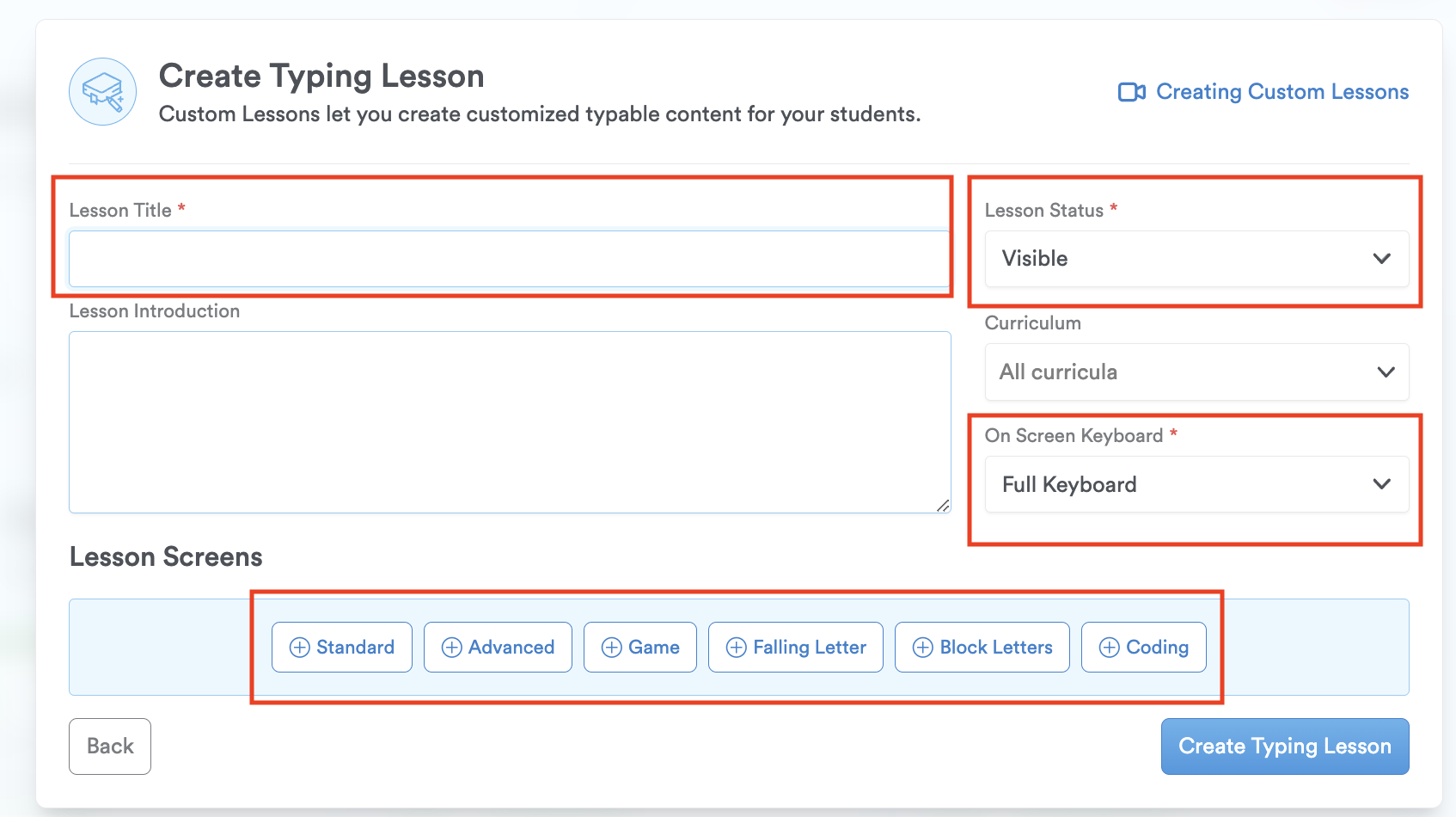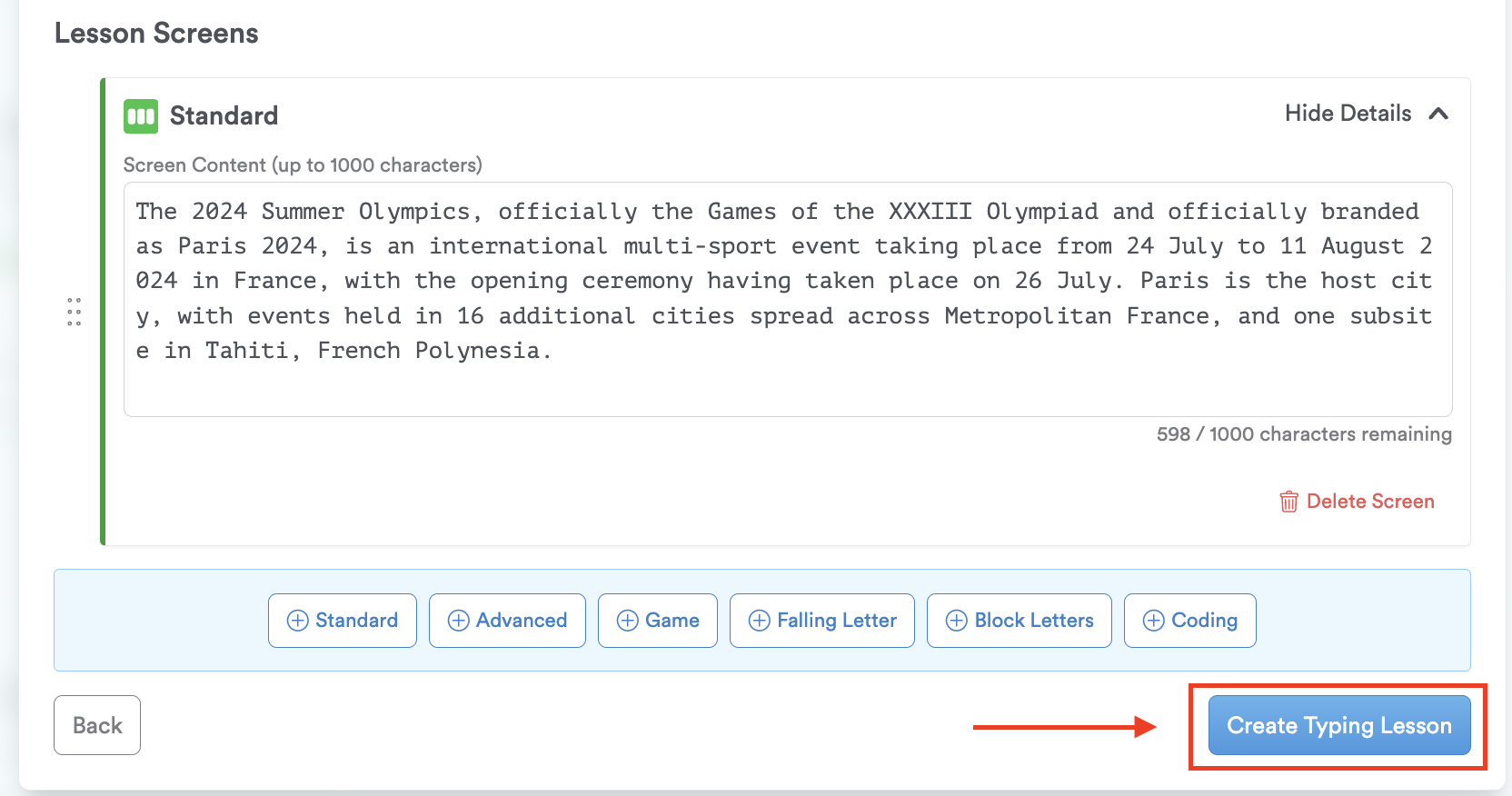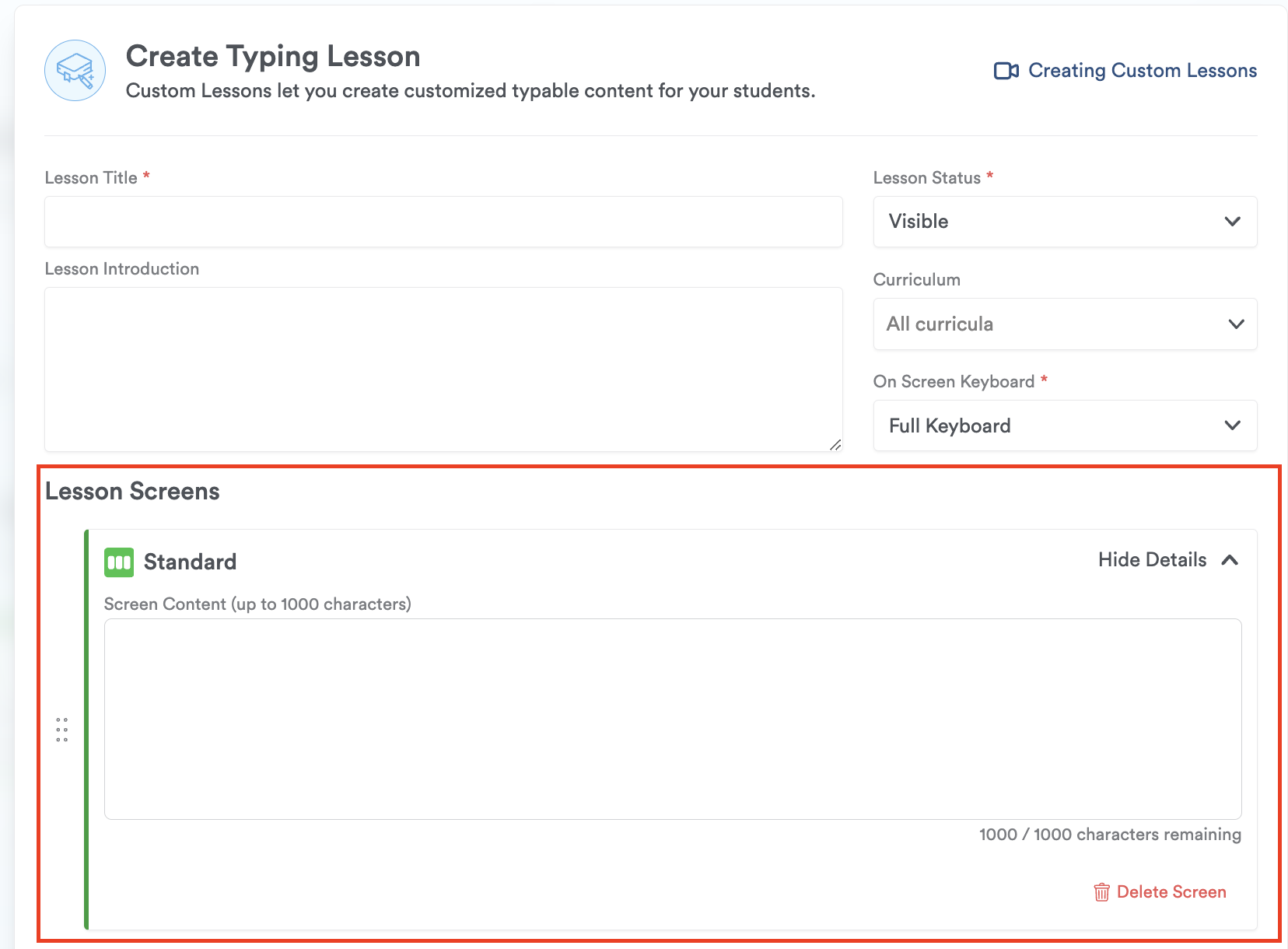 Step 7: Add another screen by selecting the screen type, or if you are finished, click "Create Typing Lesson." Once you have created your lesson screens, click “Create Custom Lesson."