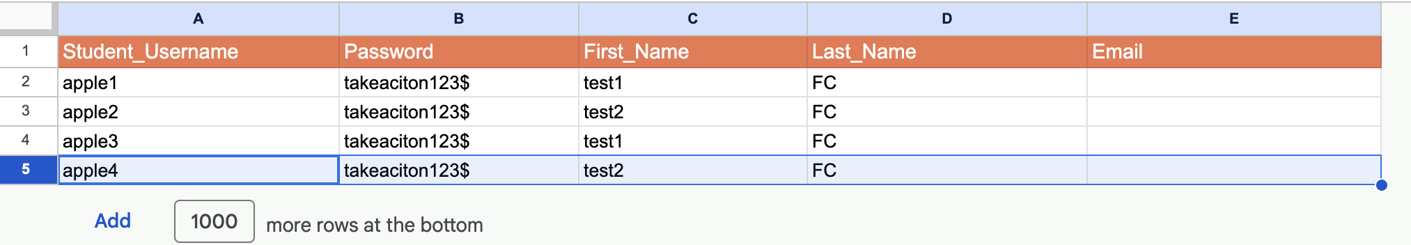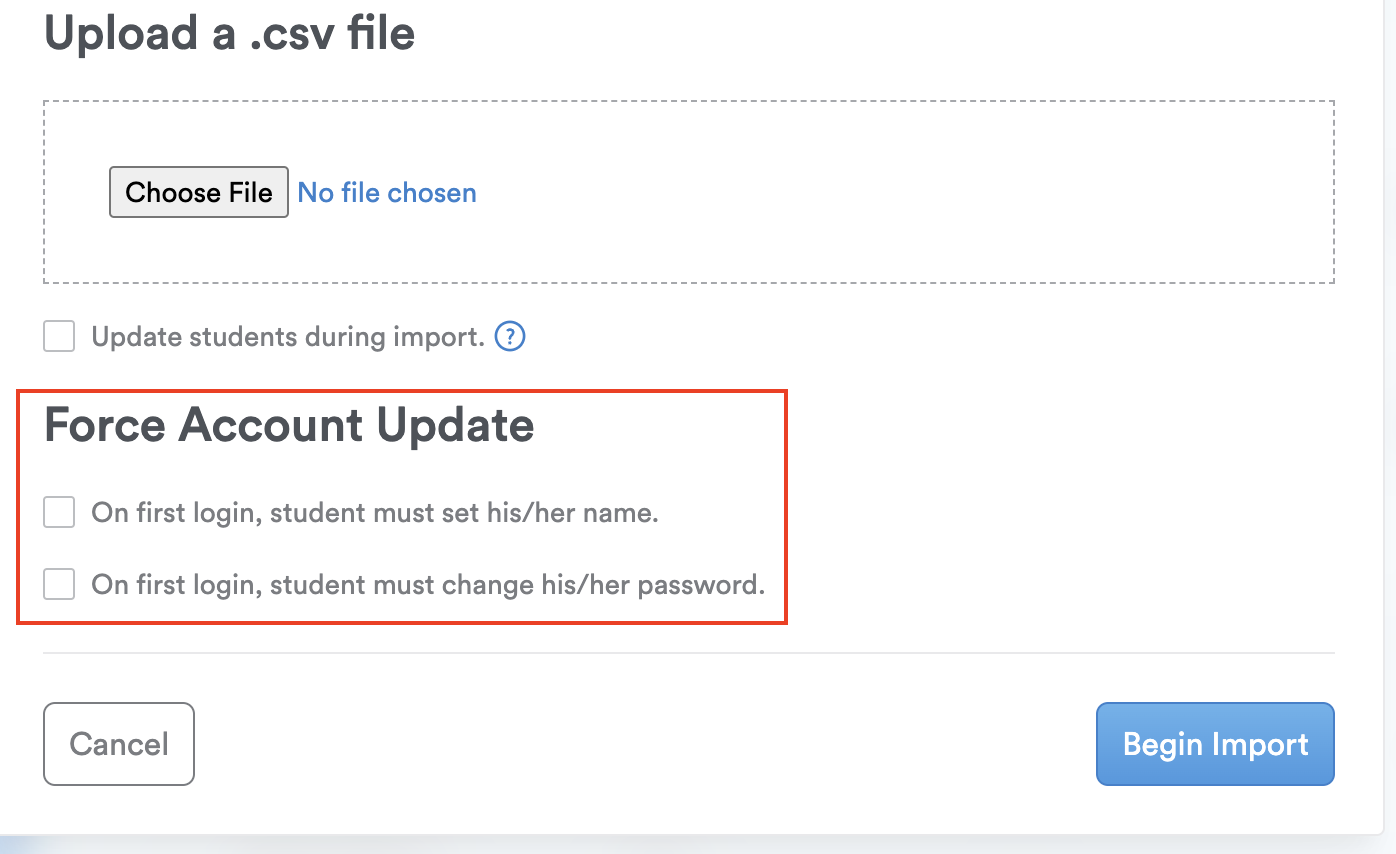If creating a list from scratch, you can assign the same password to all students. When importing the .CSV file, you can choose if you want students to set their own names and passwords upon their first login. The options will appear in the "Force Account Update" section (shown in the image below).