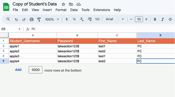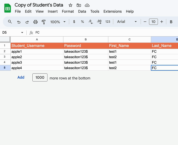 That's it! You’ve created and downloaded a Comma Separated Values (.CSV) file. Your students are now ready to be imported into Typing.com.