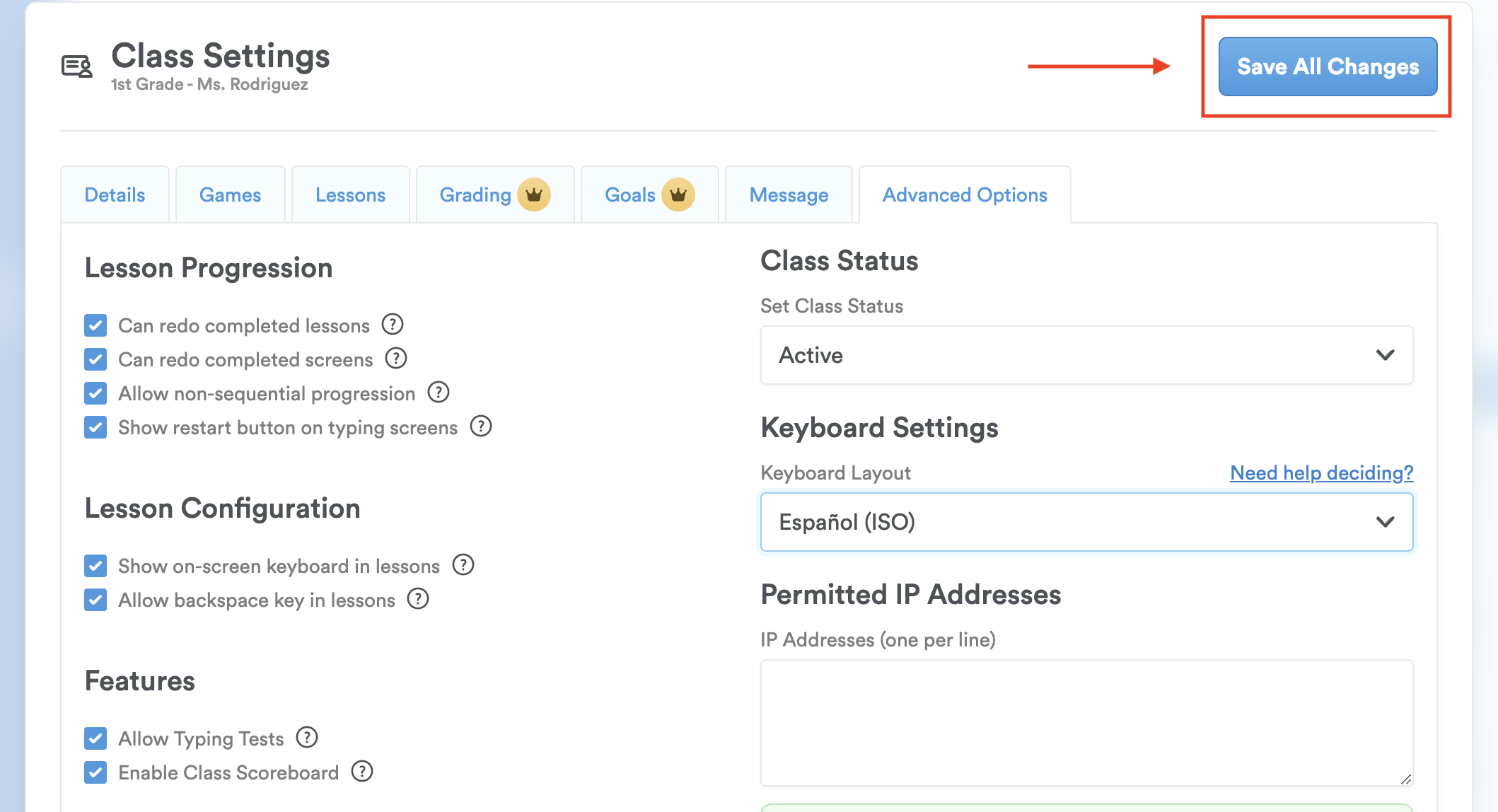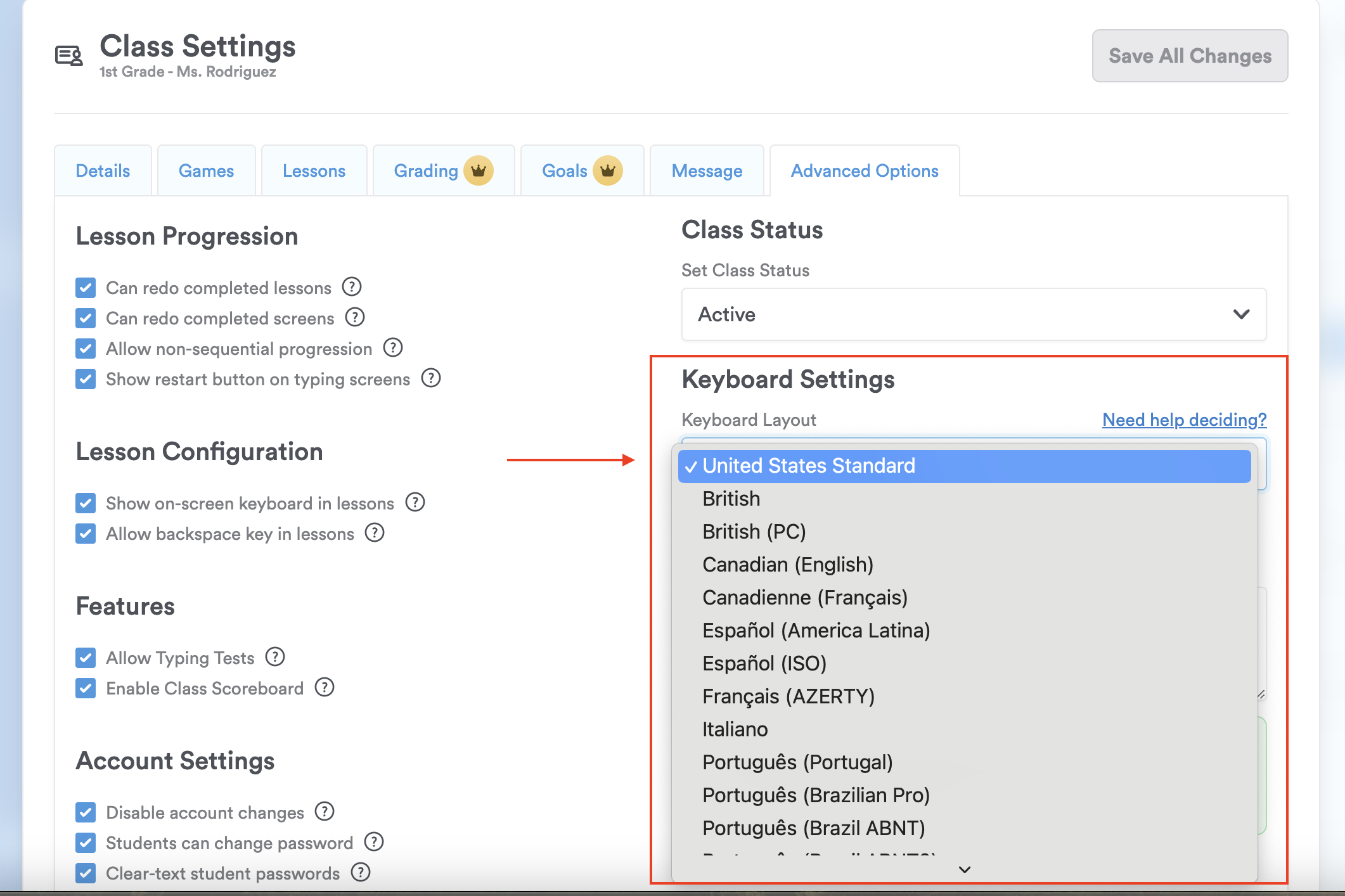 Pro-Tip: Changing the keyboard layout settings will affect the entire class. To change the keyboard layout for an individual student, a PLUS membership account is required.